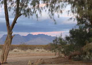 After coming back to civilization for a brief respite, we headed back into the wilds of the Mohave National Preserve south of Death Valley. This desolate desert at first seemed like, well.... Death Valley-lite after the extreme beauty we just departed a couple of days ago. The decision was to dry camp in one of their few spots for boondocking. Our choice for the night was the Kelso Sand Dunes. These dunes are close to 700 feet in height and spread out over a 45 square mile area. When we stopped yesterday afternoon the wind was picking up to about 25 MPH. We were somewhat protected near a couple of trees that must have come up from an underground spring in the area. When we arrived there was one other camper in the area but as the wind picked up they left; we were left alone for the night. As dusk surrounded us, the wind died down a bit so I was able to go out and take advantage of the beautiful clouds and sunset for pictures. However, this morning the wind came on even more strongly and while looking east where we should have been able to see mountains all that was visible was a huge wall of blowng sand. I have heard of sand storms, and we all have seen Lawrence of Arabia, but seeing the sand blowing on the movie screen is NOTHING like being IN the real thing as we were driving out of the Kelso Dunes camp site! I had visions of being "sanded" instead of "snowed-in" the park.